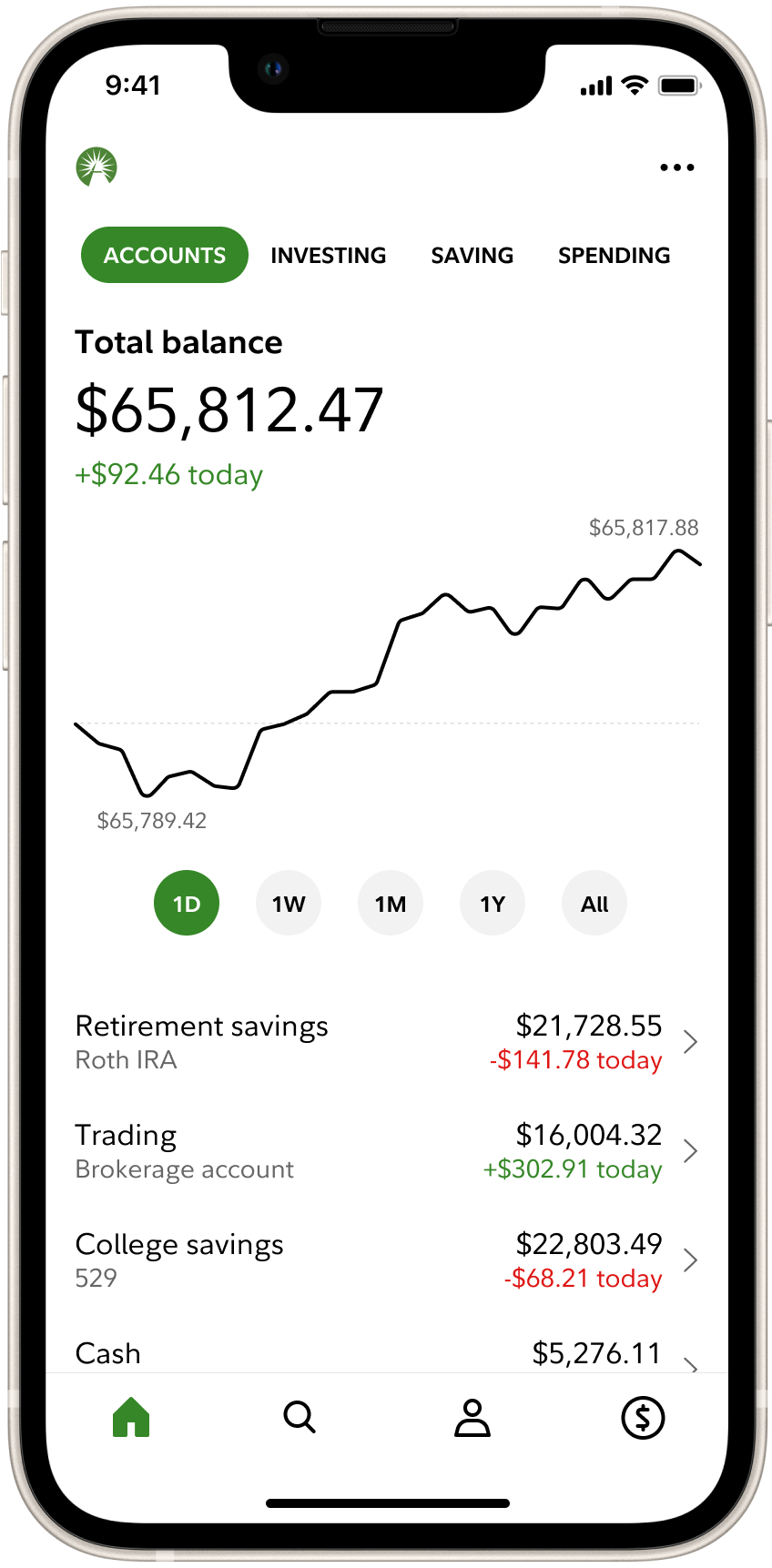 In addition to viewing their accounts, Home displays their finances through three lenses that align to Fidelity's retail offering: Saving, Spending, and Investing.